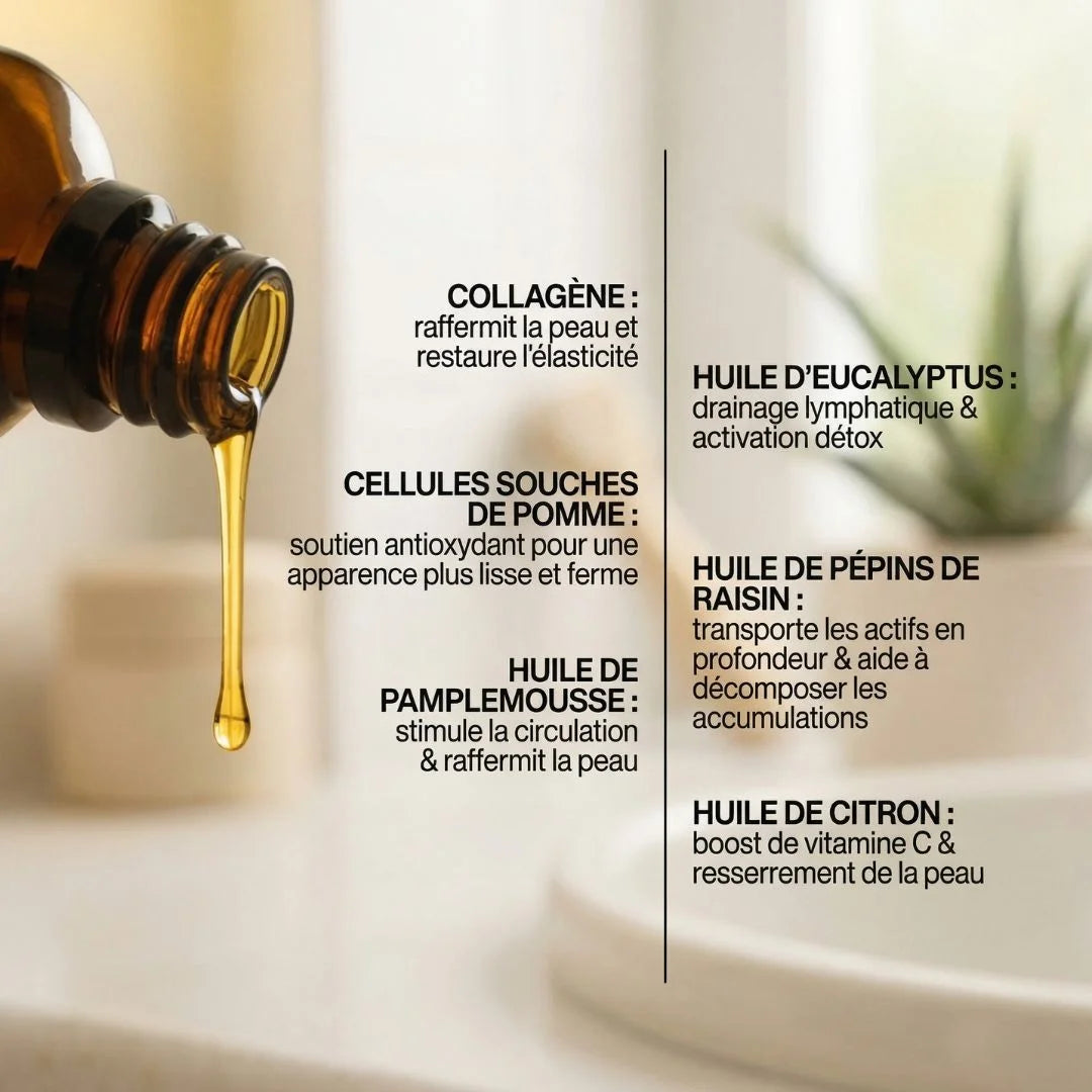 Cette huile transforme un simple massage quotidien en vrai rituel ciblé pour aider la peau à paraître plus lisse, plus souple et visiblement moins irrégulière. La marque met en avant une action sur l’aspect de la cellulite, la fermeté visuelle et l’hydratation, avec une texture légère pensée pour être utilisée facilement chaque jour.