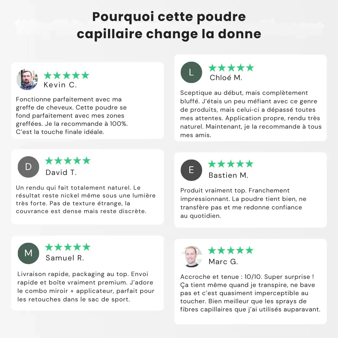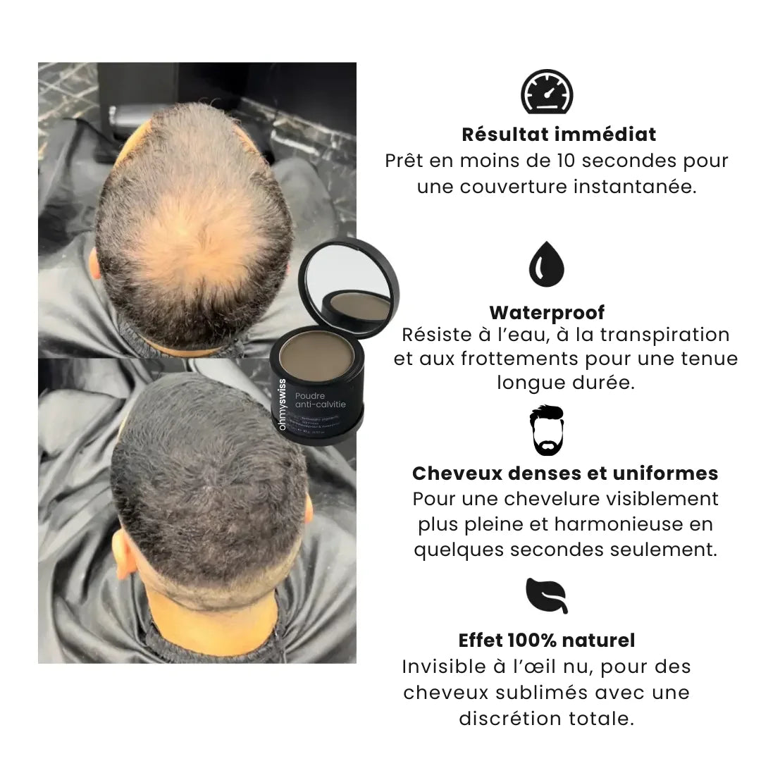 Complètement indétectable, à moins que vous le disiez. La Poudre anti‑calvitie OhMySwiss™ se fond dans vos cheveux naturels, même en pleine lumière ou de très près. La texture imite la densité de vrais cheveux, sans fini crayeux ni brillance artificielle, si bien que la plupart des gens ne sauront même pas que vous utilisez un produit.